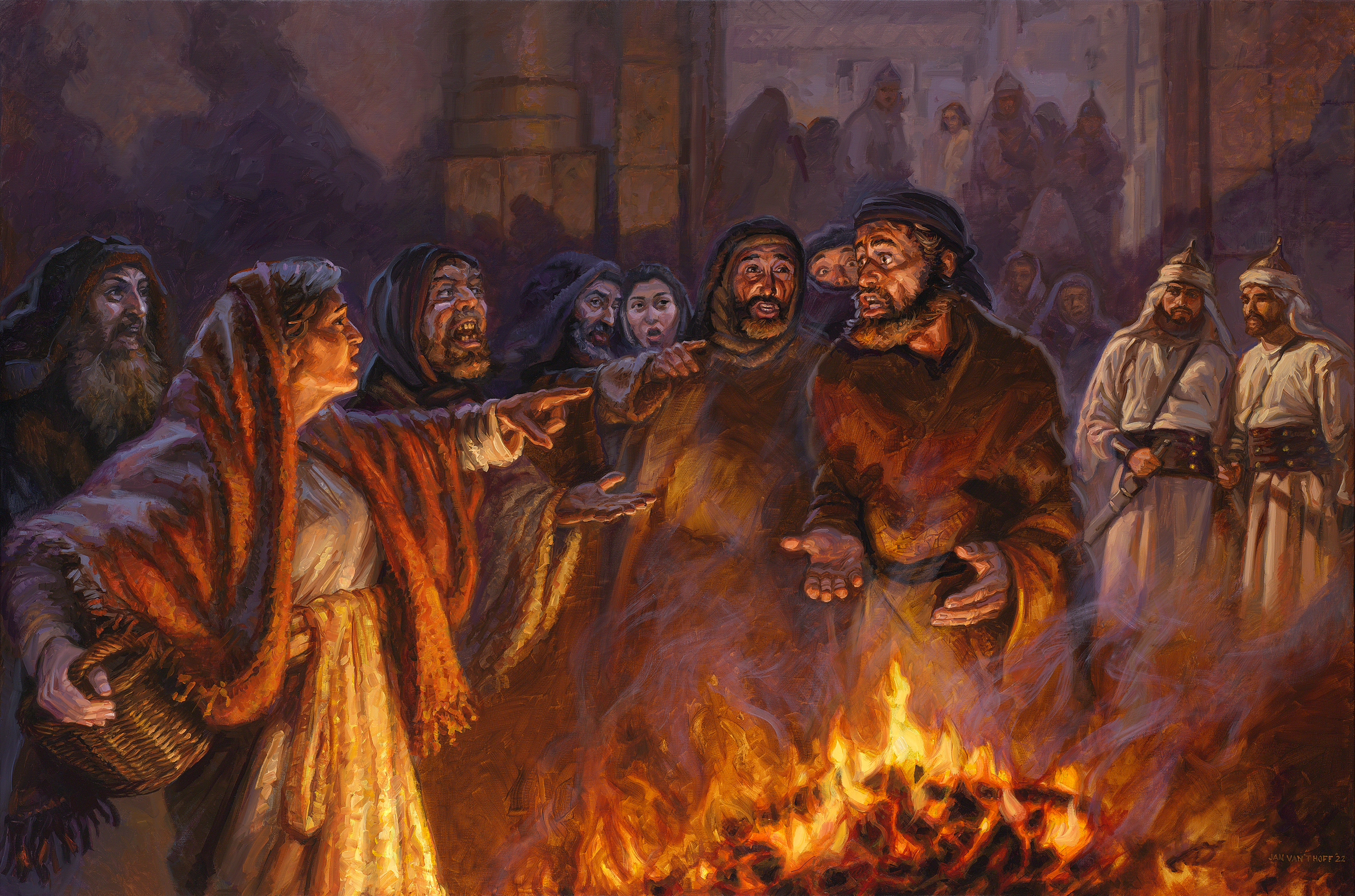 arcykapłana. Piotr podążył za Nim trzymając dystans, aż na dziedziniec domu. Tam płonął ogień węglowy. Była to