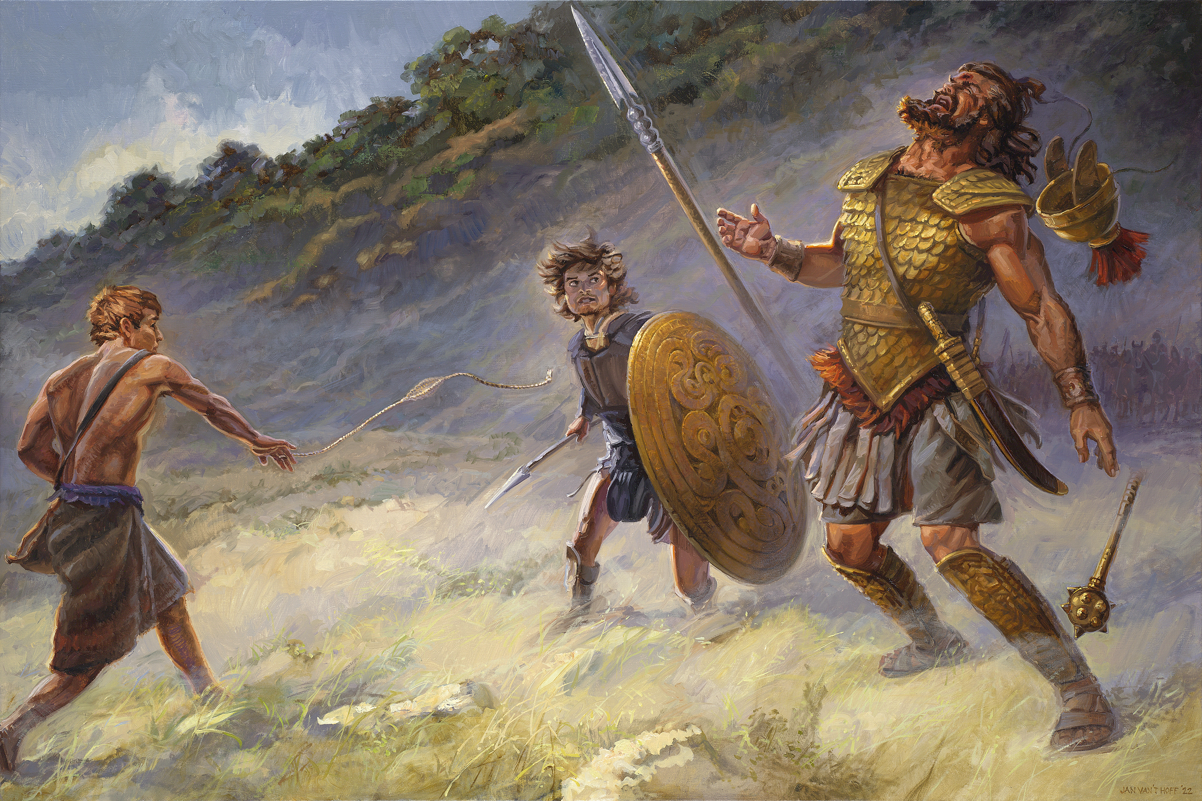 Walka z Goliatem - który nosił łuskowaną zbroję i został śmiertelnie trafiony w głowę - przypomina obietnicę z Księgi