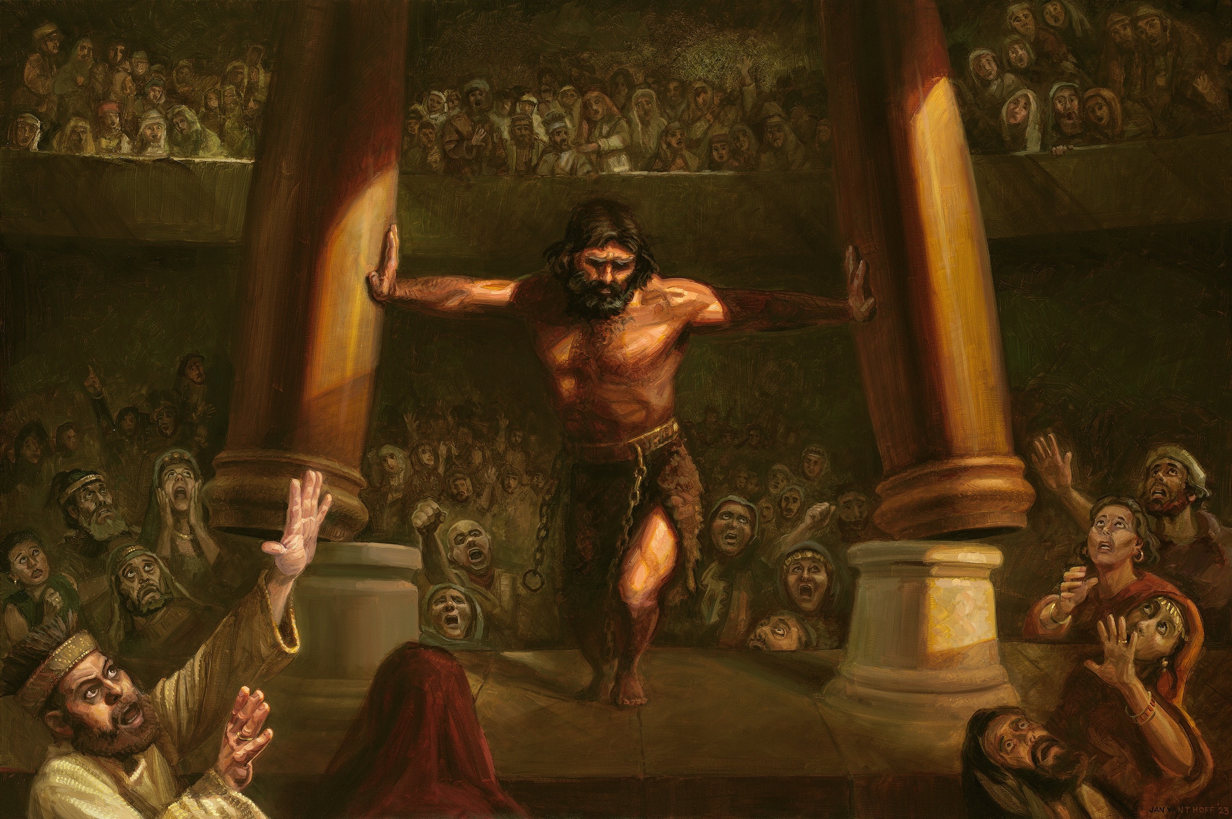 Ostatnia walka Samsona z Filistyńczykami odbywa się w świątyni Dagona. Kiedy umiera pod zawalającą się świątynią,