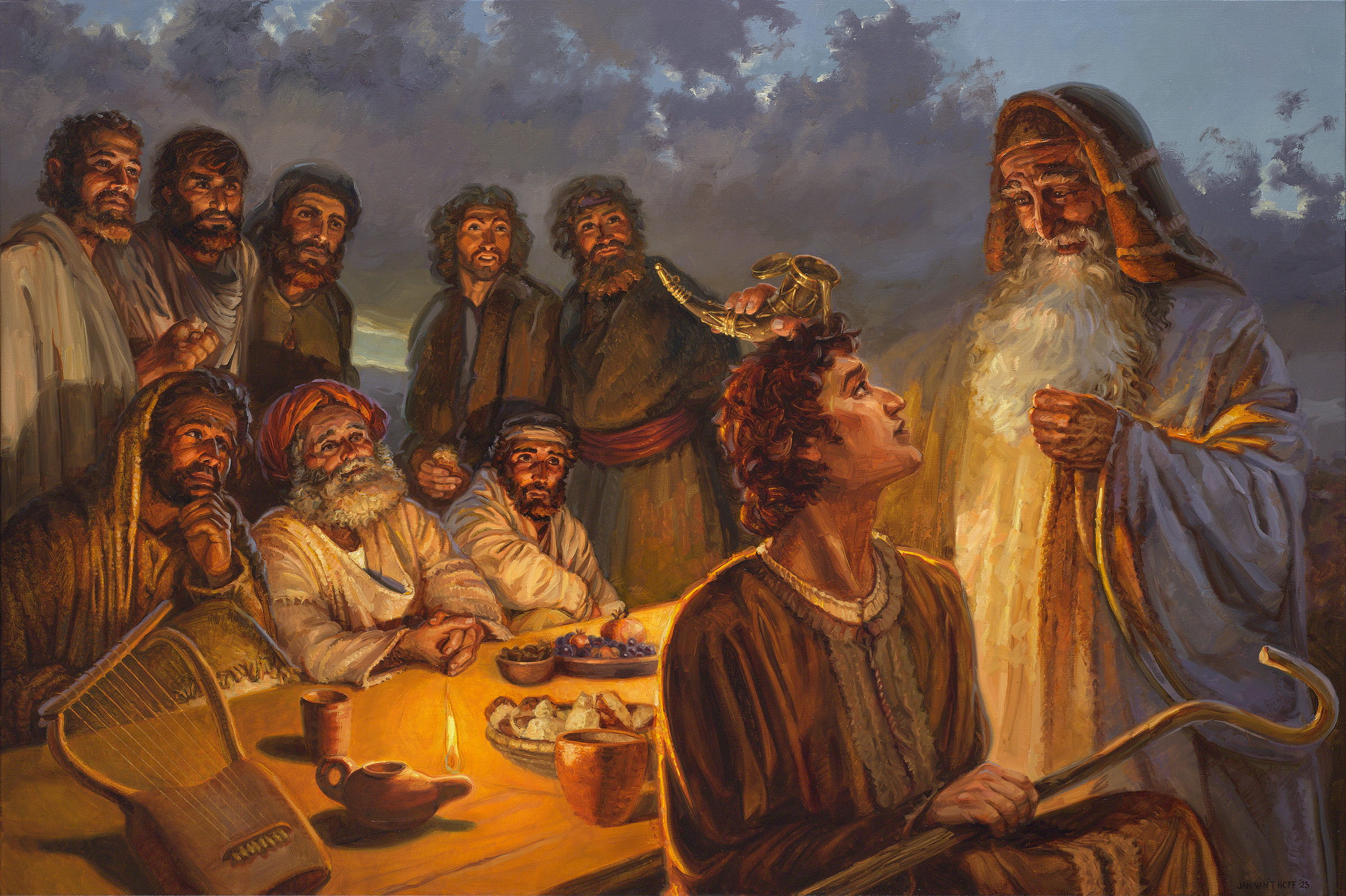 Wtedy wziął Samuel róg z olejem i namaścił go w gronie jego braci; i od tego dnia Duch Pański spoczął na Dawidzie i pozostał na nim nadal, Samuel zaś powstał i poszedł do Ramy.Pełny tekst biblijny