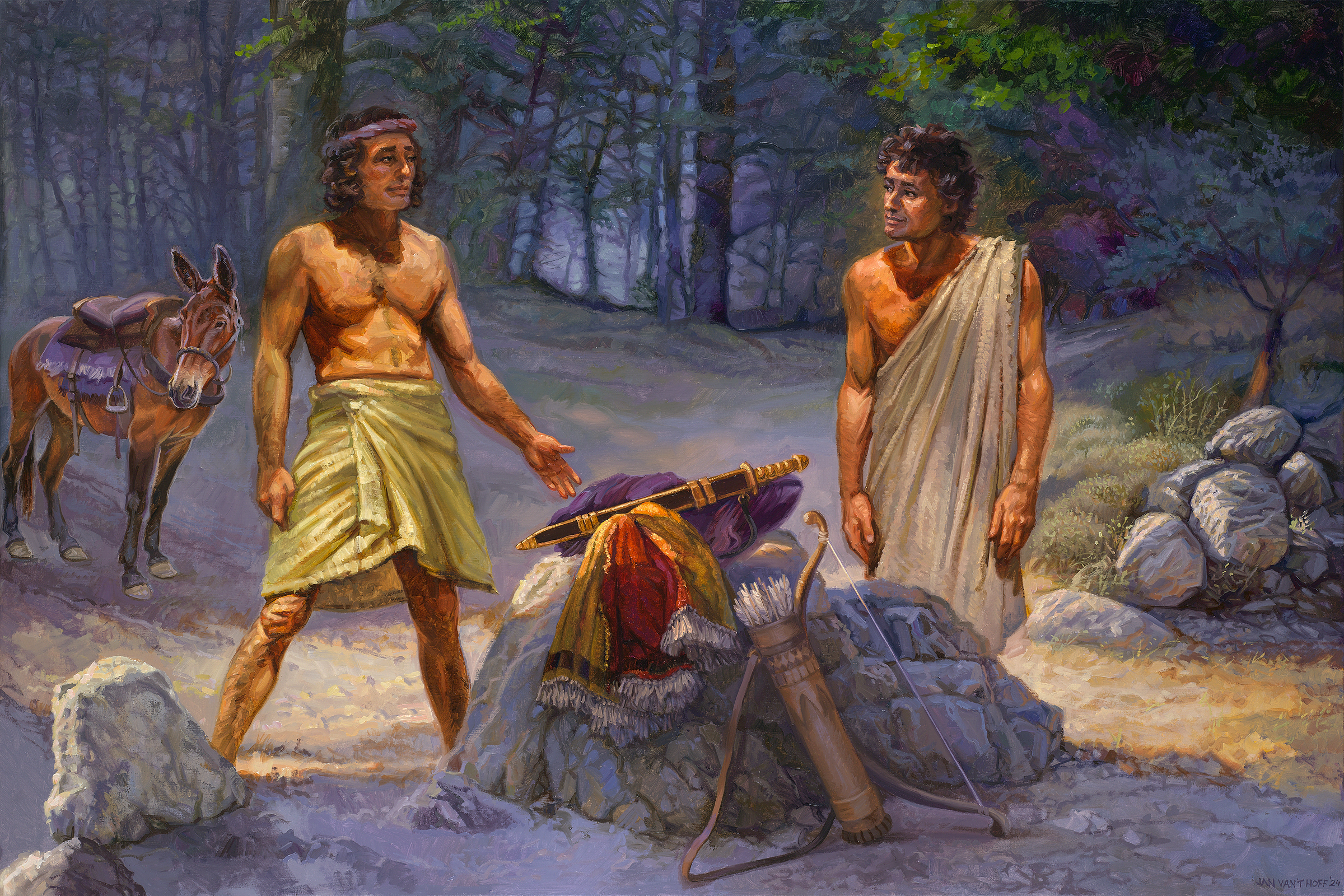 Jako znak tego przymierza Jonatan daruje Dawidowi swoje ubranie, miecz, łuk i pas. Jonatan w ten sposób przekazuje Dawidowi znaki swojej królewskiej godności jako następca tronu. Później Jonatan uzna, że królestwo należy do Dawida. Zobacz Pierwsza Księga Samuela 20, wersety od 13 do 17 oraz Pierwsza Księga Samuela 23, werset 17. W tych wersetach przyjaźń zostaje potwierdzona z wezwaniem Imienia Boga.