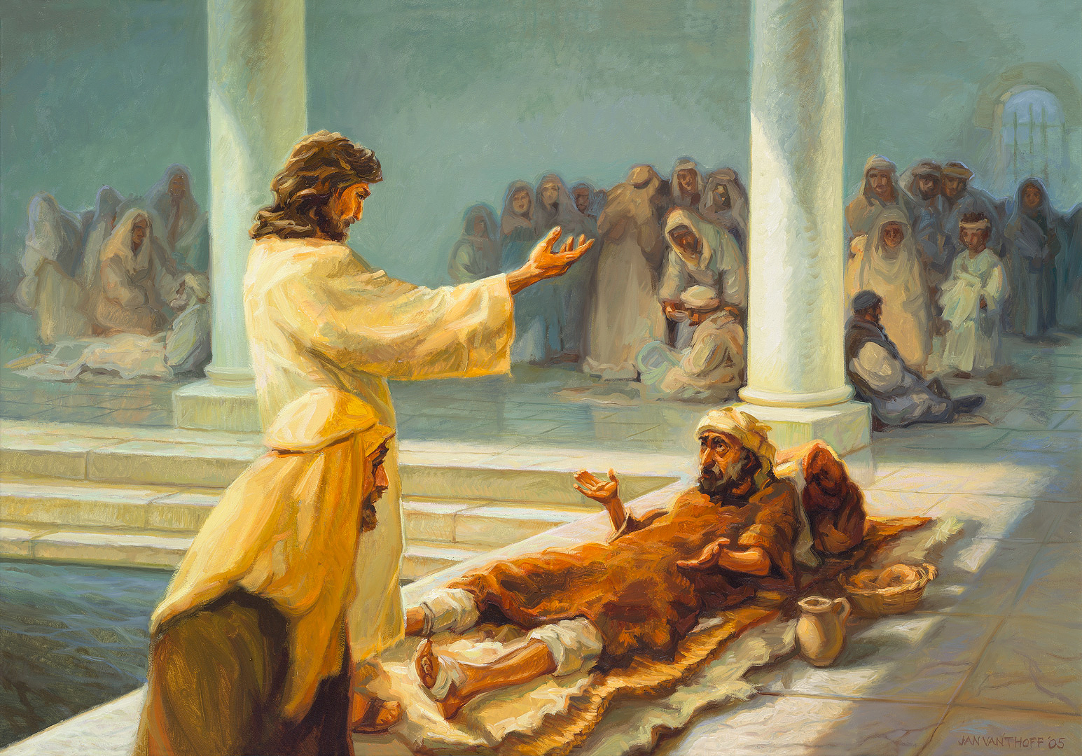 Jezus widzi leżącego mężczyznę i pyta go, czy chce wyzdrowieć. Chory mężczyzna mówi Jezusowi, że nie ma nikogo, kto