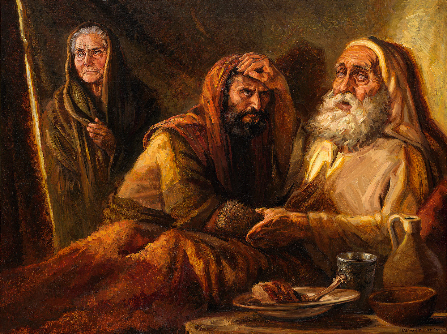 Jednak Jakub oszukuje - wespół z matką - swojego niewidomego ojca. Udaje Ezawa i w ten sposób otrzymuje