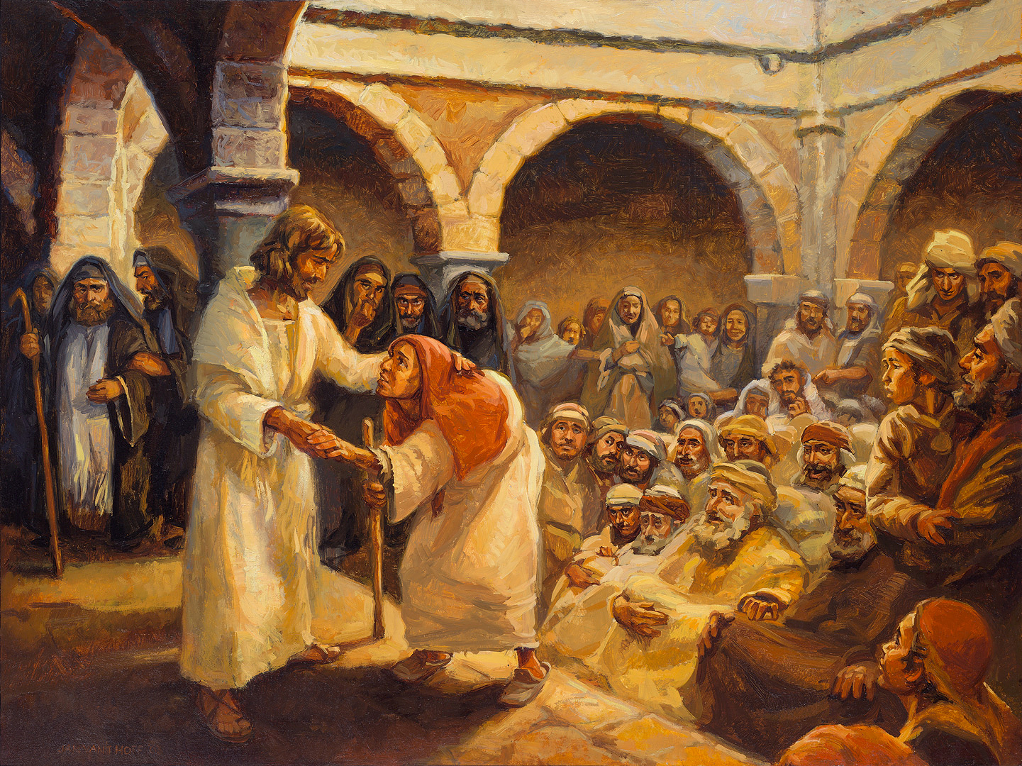 Na tym obrazie widzimy uzdrowienie zniekształconej kobiety przez Jezusa na dziedzińcu synagogi.