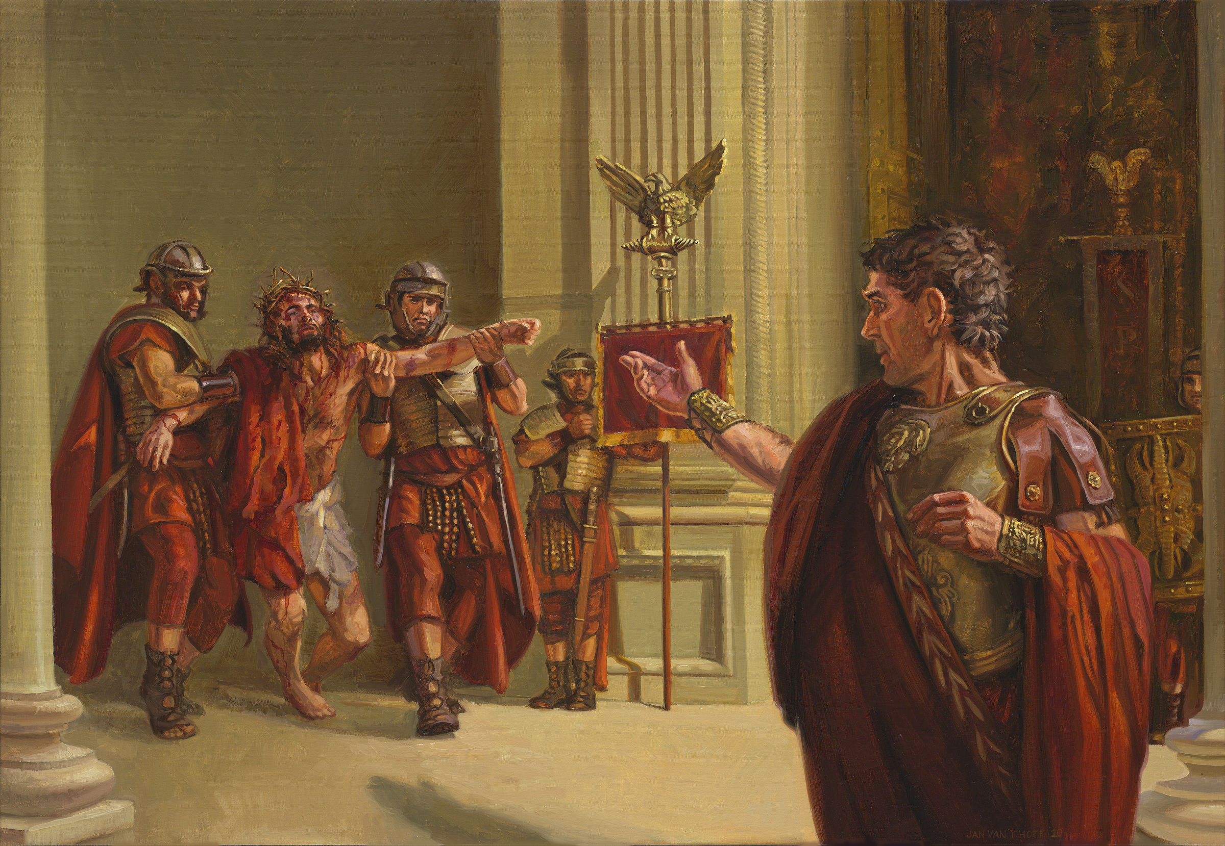 arcykapłani i uczniowie Pisma domagają się od Piłata, aby skazał Jezusa na śmierć. W rezydencji rzymskiego sądu
