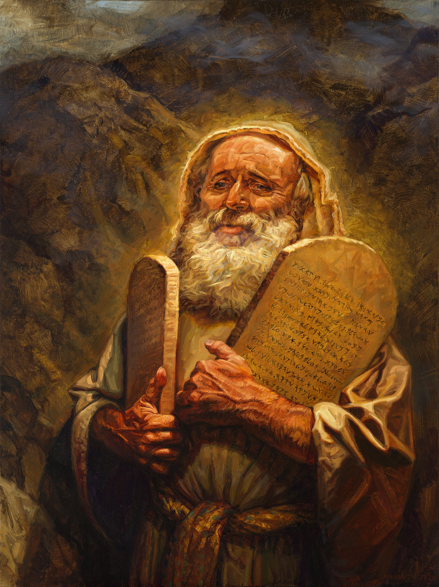 Mojżesz schodzi z góry z nowymi tabliczkami. Jego twarz świeci od oglądania chwały Boga. Przymierze jest odnowione