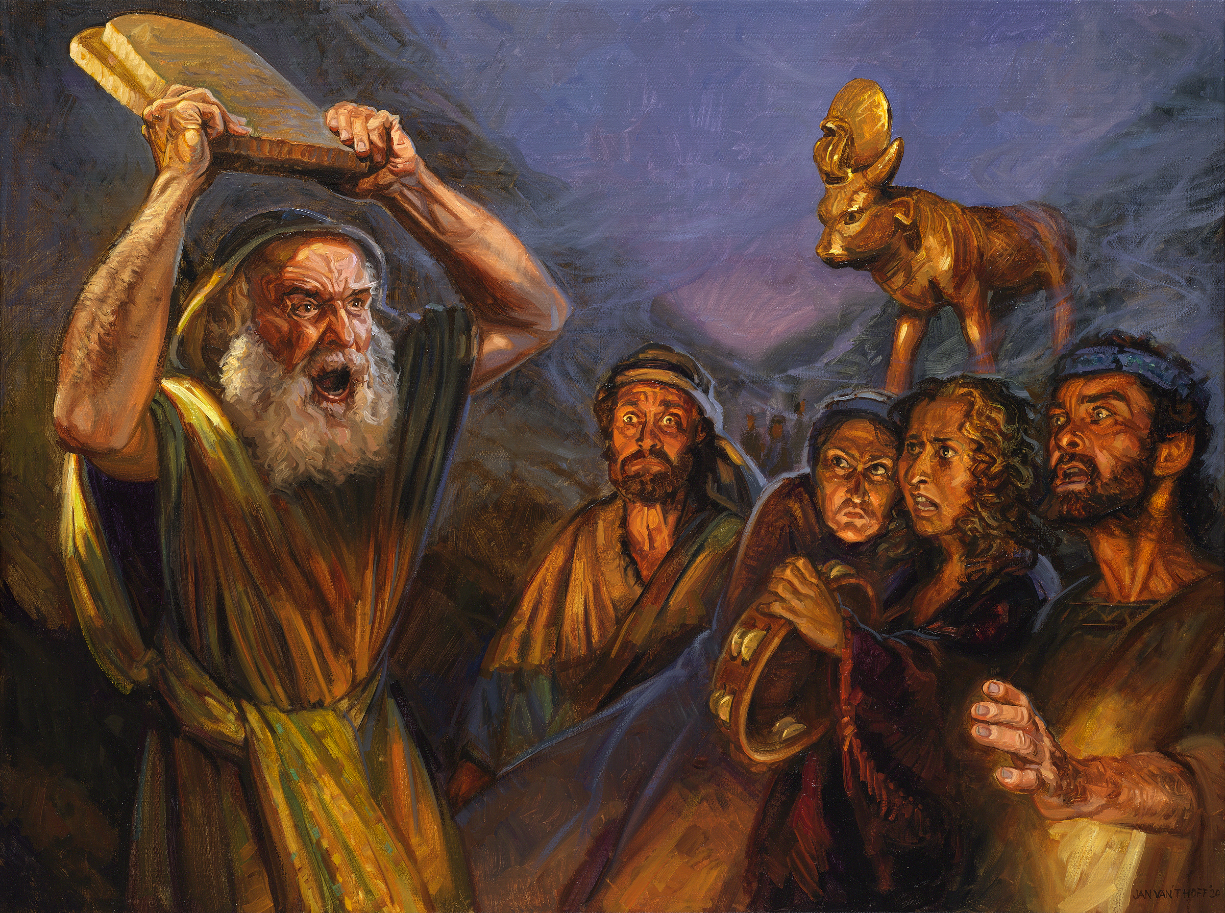 Gdy Mojżesz schodzi i widzi kult złotego cielca, wpada w gniew i rozwala tablice kamienne na kawałki u stóp góry.