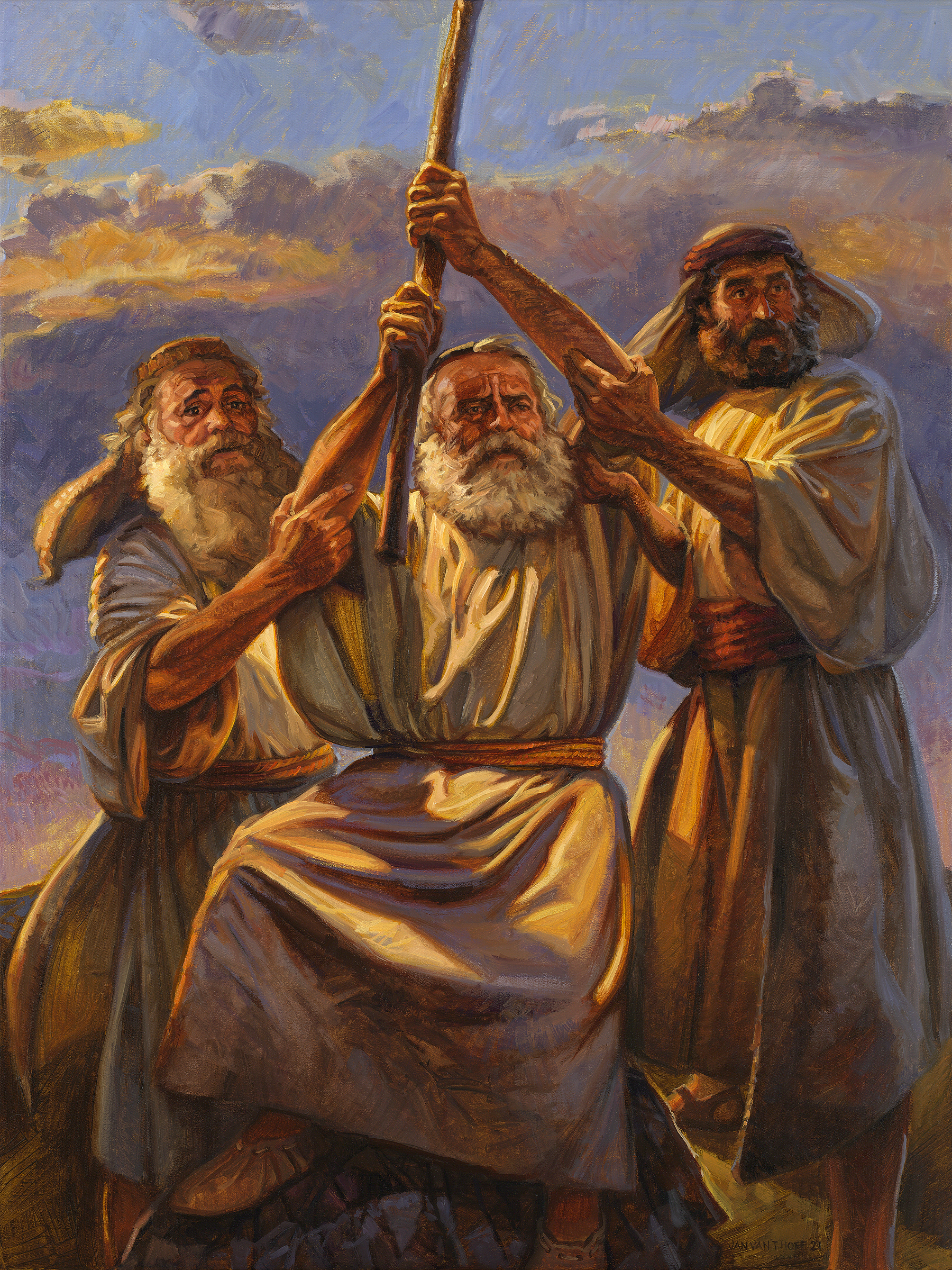 Gdy Mojżesz opuszcza ręce z laską ze względu na zmęczenie, Amalekici zyskują przewagę. Aaron i Chur pomagają